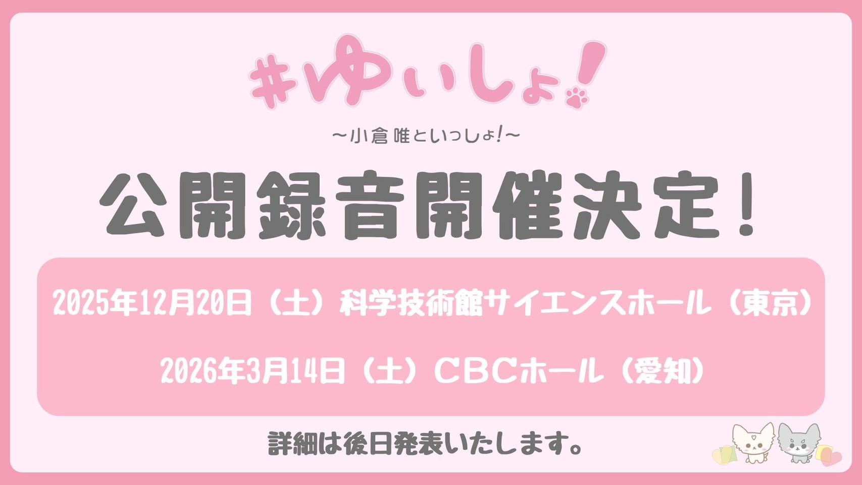 【 EVENT 】#ゆいしょ!~小倉 唯といっしょ!~リニューアル記念✨ 2会場で公開録音開催決定!
