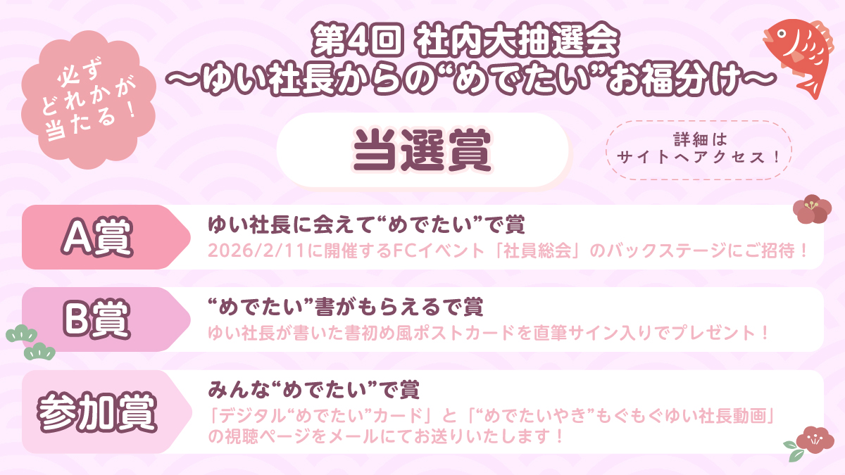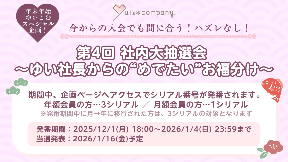 【Yui’s*company.】年末年始ゆいこむスペシャル企画「第4回 社内大抽選会~ゆい社長からの“めでたい”お福分け~」実施決定!